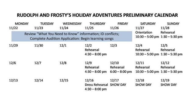 Saturdays from 10:30 a.m. to 5:00 p.m.; Sundays from 1:30 p.m. to 5:30 p.m.; and, Thursdays from 4:30 p.m. to 8:00 p.m. NOTE: Not all cast may be needed at all rehearsals or for all the scheduled rehearsal time on any day. Additional rehearsals may be called, if needed, with Friday from 6:00 to 8:00 most likely option (but otherwise based on cast consultation as to scheduling. SEE ALSO Calendar to left.