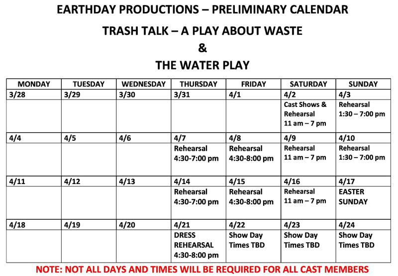 The range for rehearsals are as follows: Saturdays from 11:00 a.m. to 7:00 p.m.; and Sundays from 1:30 p.m. to 7:00 p.m.; and Thursdays from 4:30 p.m. to 7:00 p.m.; and Fridays from 4:30 p.m. to 8:00 p.m. NOTE: Individual rehearsal schedules will vary depending on the extent of involvement (e.g., cast in both plays or just one, etc.). Not all cast may be needed at all rehearsals or for all the scheduled rehearsal time on any day. Additional rehearsals may be called, if needed, based on cast consultation as to scheduling. SEE ALSO Calendar to left.
